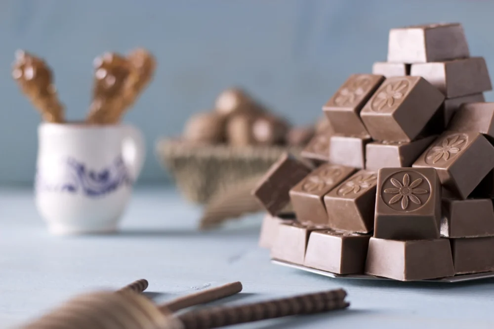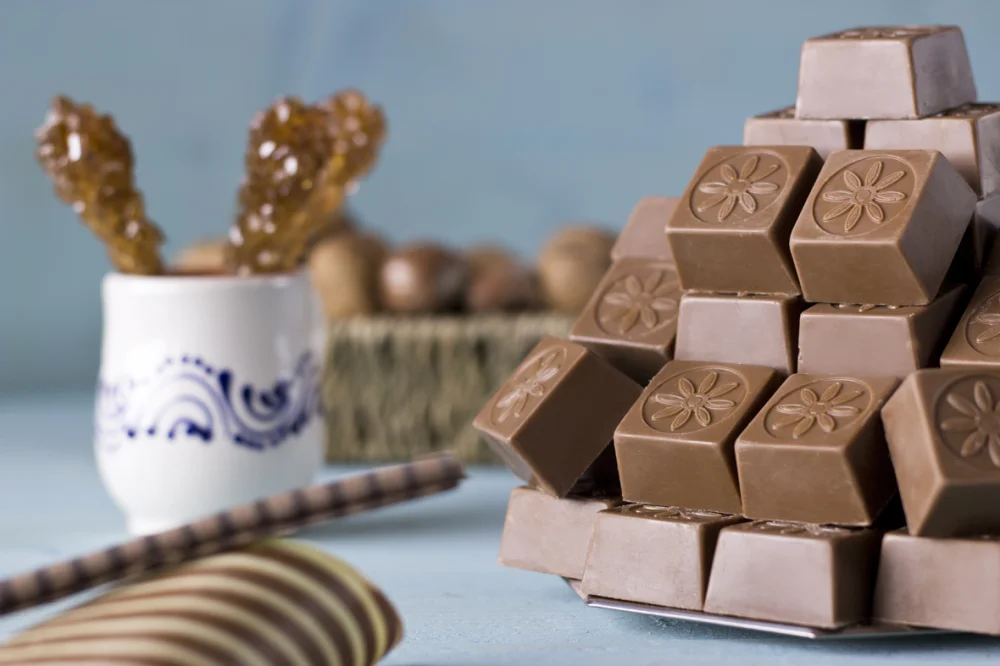 Ingrediente: crema 54% de: ciocolata alba cu pasta caramel, decorate cu: ciocolata cu LAPTE 46%.