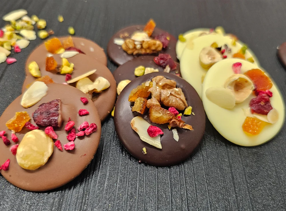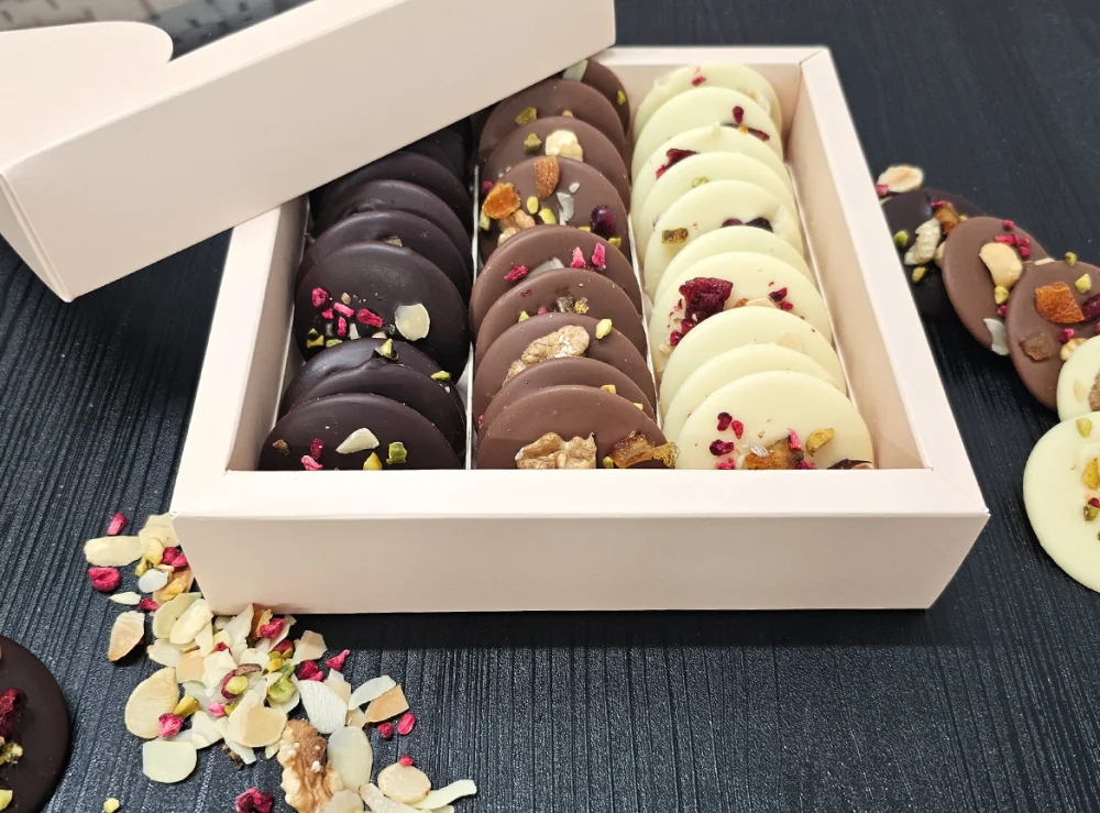 ciocolata alba 25% (zahar, unt de cacao, LAPTE praf integral, emulsifiant: lecitina de SOIA, aroma naturala de vanilie. Continut minim de cacao 28%), ciocolata cu LAPTE 25% (zahar, unt de cacao, LAPTE praf integral, masa de cacao, emulsifiant; lecitina de SOIA, aroma naturala de vanilie. Continut minim de cacao 33.6%), Ciocolata neagra 29% (masa de cacao, zahar, unt de cacao, emulsifiant: lecitina de SOIA, aroma naturala de vanilie. Continut minim de cacao 54.5%), decor mixt 21% (FISTIC granulat, ALUNE DE PADURE, NUCA, coaja portocala confiata, zmeura liofilizata, filgi de MIGDALE, merisoare, caise deshidratate).