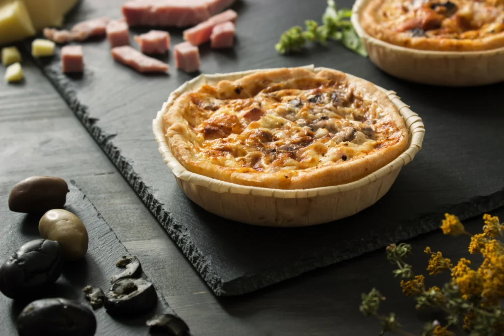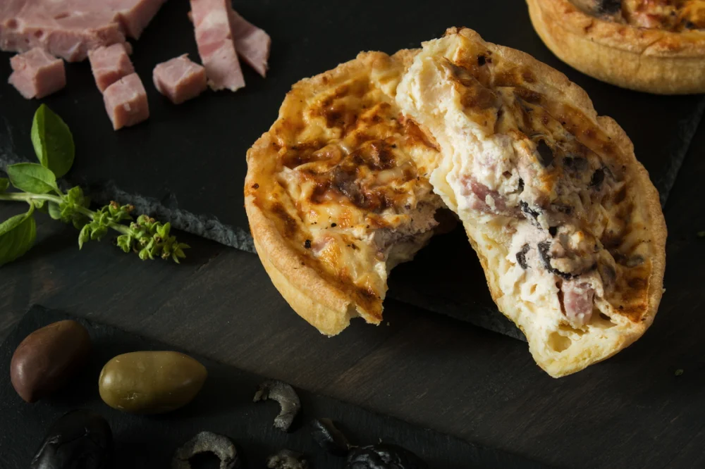 Ingrediente: cosulet sarat din aluat fraged 31% [faina alba de GRAU 550, unt 82% (SMANTANA, culturi lactice, acid lactic), OUA pasteurizate (OUA pasteurizate, conservant: benzoat de sodiu), apa, sare, zahar], umplutura 69% {SMANTANA 16% (LAPTE de vaca pasteurizat, culturi lactice selectionate), OUA pasteurizate (OUA pasteurizate, conservant: benzoat de sodiu), lapte 1.5%, sunca praga 16% [pulpa de porc, apa, carne de porc, amidon, sorici, agent de intarire (lactat de sodiu), sare, zaharuri (dextroza), proteina vegetala din SOIA, stabilizatori (trifosfati), fibre vegetale, proteina animala din porc, agent de ingrosare (caragenan), antioxidant (ascorbat de sodiu, extract bogat in tocoferol), potentiatori de aroma (proteina vegetala hidrolizata, extract de drojdie), arome, conservant (nitrit de sodiu)], cascaval 8% (LAPTE de vaca pasteurizat, sare, culturi lactice, cheag), masline kalamata 6% (masline, apa, sare, ulei de masline, otet, acid citric)}.