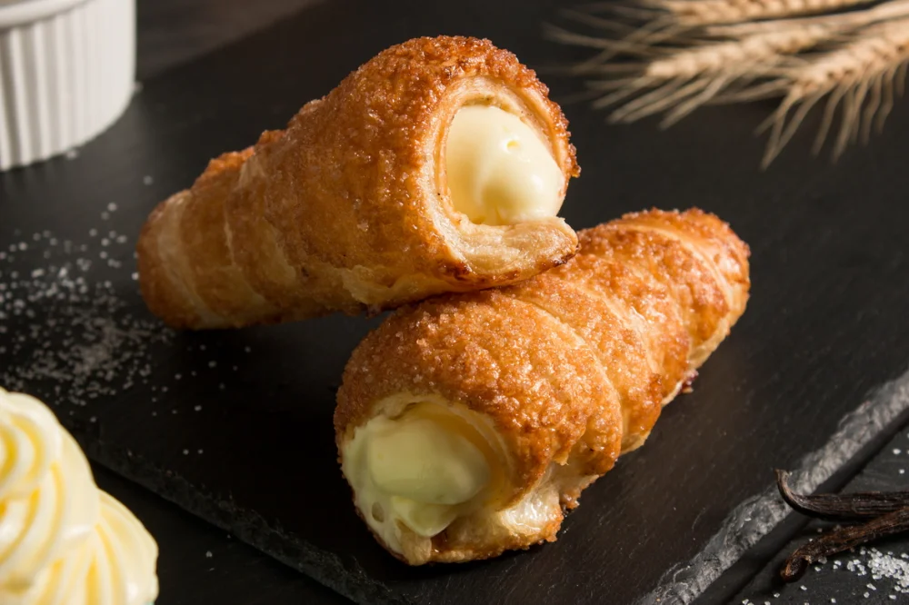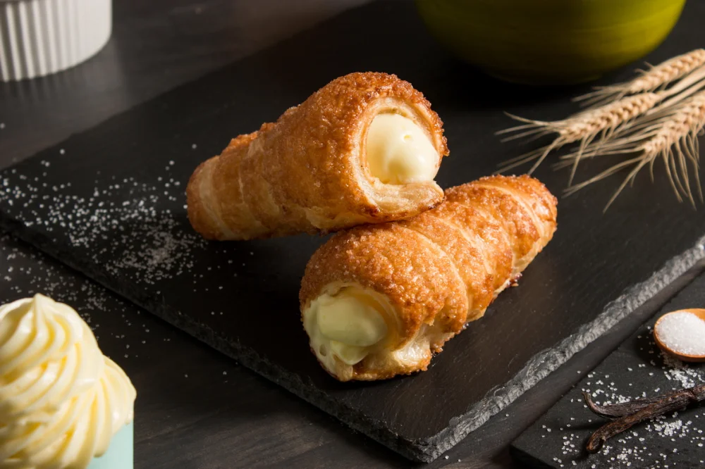 Ingrediente: aluat de foietaj 48% {faina foietaj alba de GRAU 550 [enzime (α-amilaza, xilanaza, lipaza), aditivi (cisteina), GLUTEN vital, antioxidant (acid ascorbic)], faina alba de GRAU 550, apa, margarina [grasimi vegetale (palmier), apa, sare, emulgatori (mono- si digliceride ale acizilor grasi, lecitina din floarea soarelui), regulator aciditate (acid citric), conservant (sorbat de potasiu, arome, colorant: beta-caroten)], ulei de floare soarelui, sare iodata, otet, OU pasteurizat (OU pasteurizat, conservant: benzoat de sodiu), zahar}, sirop cu zahar si miere 13% (apa, zahar, miere), umplutura cu crema de vanilie 39% {apa, praf instant de vanilie 8% [zahar, amidon modificat, zer pudra (LAPTE), LAPTE praf degresat, grasimi vegetale (palmier), agent gelatizant alginat de sodiu, difosfati+sulfat de calciu <1.2%, sare iodata, aroma, coloranti:carotene, riboflavin], FRISCA 5% [SMANTANA din LAPTE de vaca, stabilizator: caragenan, aditiv: lactat de calciu, emulsifiant: mono- și digliceride ale acizilor grasi), zahar], LAPTE praf 26% grasime}.