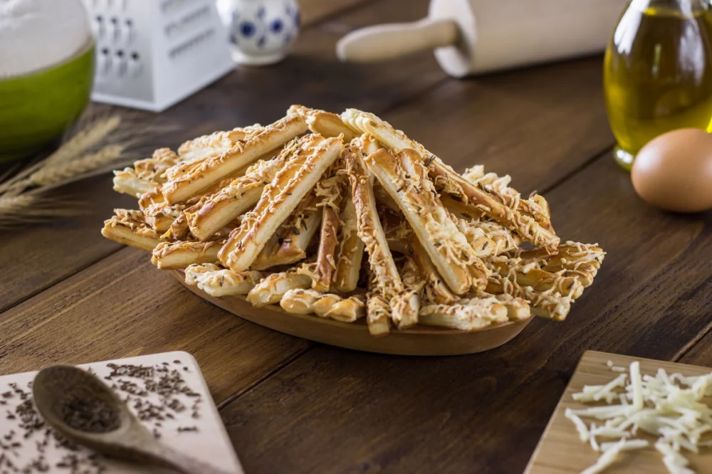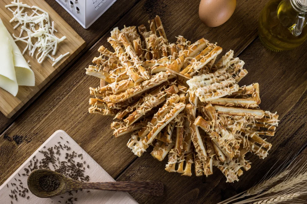 Ingrediente: aluat de foietaj 90%, decorat cu: CASCAVAL 7 %, OU 3% si chimen.