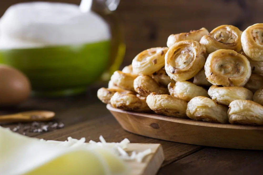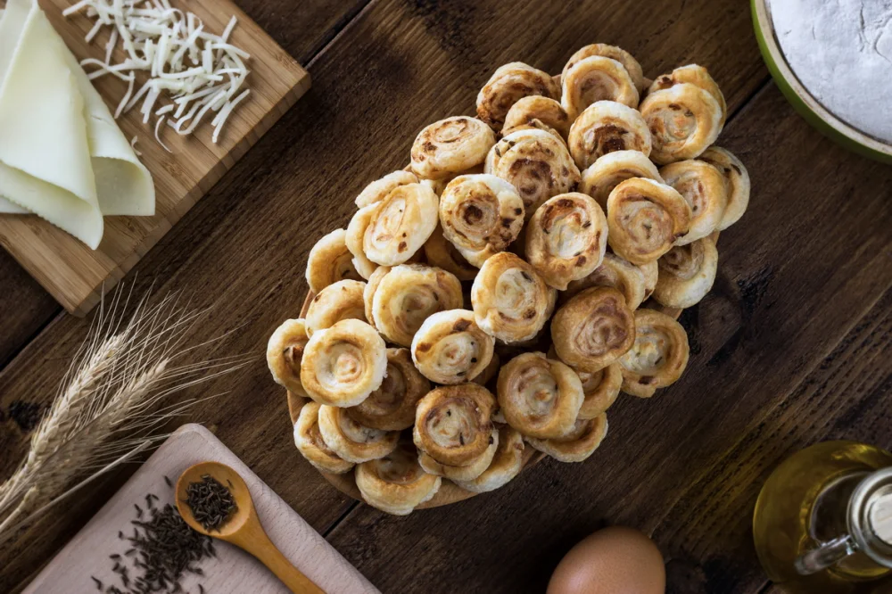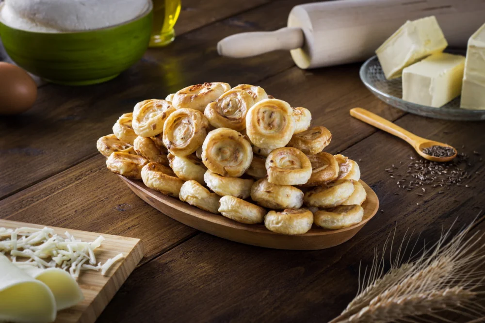 Ingrediente: aluat de foietaj 70% , umplutura cu: TELEMEA de vaca 24% si chimen , decorat cu: OU 6%
