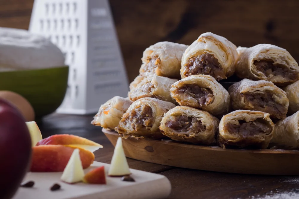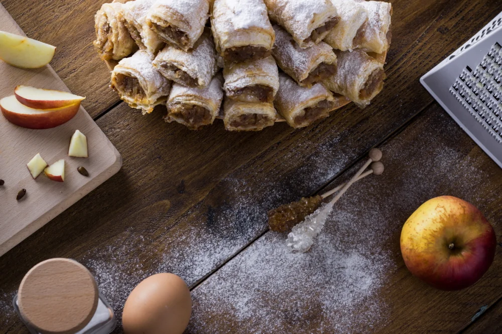 Ingrediente: foaie de placinta romaneasca 44%, umplutura cu mere si scortisoara 55%, decorat cu: zahar pudra 1%