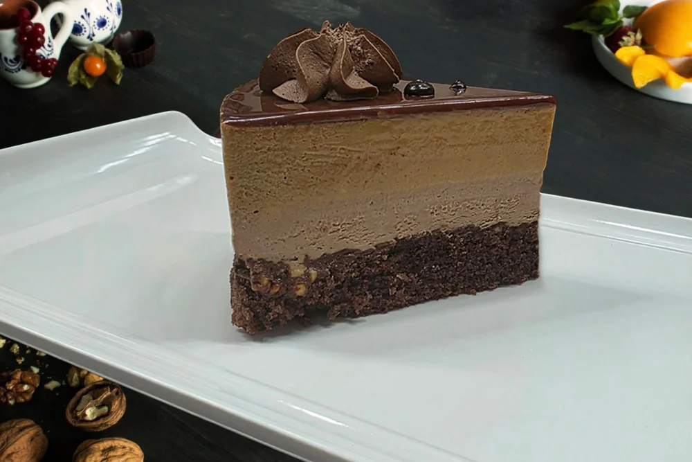 Ingrediente: blat de cacao 14% [OUA pasteurizate (OU, conservant: benzoat de sodiu), faina alba de GRAU 550, zahar, cacao alcalinizata, ulei de floarea soarelui, bicarbonat de sodiu, sare iodata], sirop 9% (apa, zahar), strat crocant 14% cu: crema de LAPTE cu cacao, ALUNE caramelizate si foi de napolitana cacao {glazura alba [grasimi vegetale (ulei de palmier, floarea soarelui), zahar, zer pudra (LAPTE), emulsifiant (lecitina de SOIA), aroma naturala de vanilie], glazura neagra [zahar, grasimi vegetale ( palmier, floarea- soarelui), pudra de cacao (15%), emulsifiant (lecitina de SOIA), vanilie, aroma], ARAHIDE caramelizate 3% (granule ARAHIDE, zahar caramel) si fulgi de napolitana 3% [faina de GRAU, grasimi vegetale (ulei de floarea soarelui, rapita in proportii variabile), proteina din LAPTE, sare, extract de ORZ, agent de ingrosare: carbonat acid de sodiu, emulsifiant: lecitina de floarea soarelui, antioxidant: tocoferol concentrat ], tableta alba [zahar, grasime vegetala fractionata si pe deplin hidrogenata (ulei din samburi de palmier), praf de zer din LAPTE, LAPTE praf integral, emulgatori: sorbitan tristearat, lecitina de SOIA, lecitina de floarea soarelui, mono- și digliceride ale acizilor grași, aroma]}, mousse de ciocolata cu LAPTE 23% [FRISCA (SMANTANA din LAPTE, stabilizator: caragenan, aditiv: lactat de calciu, emulsifiant: mono- și digliceride ale acizilor grasi), zahar, ciocolata cu LAPTE (zahar, unt de cacao, LAPTE praf integral, masa de cacao, emulsifiant lecitina din SOIA, aroma de vanilie. Continut minim de cacao 32%), stabilizator pudra pentru frisca (zahar, sirop de glucoza deshidratat, gelatina, galbenus de OU pudra, corector de aciditate difosfat)], mousse de ciocolata alba si pasta caramel sarat cu UNT 30% [FRISCA (SMANTANA din LAPTE, stabilizator: caragenan, aditiv: lactat de calciu, emulsifiant: mono- și digliceride ale acizilor grasi), zahar, ciocolata alba (zahar, unt de cacao, LAPTE praf integral, emulsifiant lecitina din SOIA, aroma de vanilie. Continut minim de cacao 29%), stabilizator pudra pentru frisca (zahar, sirop de glucoza deshidratat, gelatina, galbenus de OU pudra, corector de aciditate difosfat), pasta caramel sarat cu UNT 8% (zahar, grasimi vegetale: ARAHIDE, UNT, LAPTE praf degresat, zahar ars 5%, LAPTE praf, sare 2%, arome naturale, emulsifiant: lecitina, antioxidant: alfa tocoferol)], decorat cu: glazura de ciocolata 9% [ciocolata neagra (zahar, unt de cacao, LAPTE praf integral, emulsifiant: lecitina de SOIA, aroma naturala de vanilie. Continut minim de cacao 28%), glucoza, zahar, LAPTE condensat (LAPTE, stabilizatori: fosfat de sodiu, caragenan), apa, gelatina (rehidratata, din sursa bovina)], ciocolata cu LAPTE (zahar, unt de cacao, LAPTE praf integral, masa de cacao, emulsifiant; lecitina de SOIA, aroma naturala de vanilie. Continut minim de cacao 33.6%), aveline din crema cu ciocolata si crema vegetala 6% {crema cu ciocolata[ FRISCA (SMANTANA din LAPTE de vaca, stabilizator: caragenan, aditiv: lactat de calciu, emulsifiant: mono- și digliceride ale acizilor grasi), tableta de cacao [grasimi vegetale (seminte de palmier, nuca de cocos), zahar, cacao cu 10-12% unt de cacao, LACTOZA, emulsificator: lecitina de SOIA, arome], ciocolata neagra (masa de cacao, zahar, unt de cacao, emulsifiant: lecitina de SOIA, extract de vanilie) si crema vegetala [apa, ulei total hidrogenat din samburi de palmier, zahar, stabilizatori (sorbitoli, hidroxipropilmetilceluloza, caragenan, carboximetilceluloza sodica, guma Tara, guma Gellan), emulsifiant (polisorbat 60, monostearat de sorbitan, esteri ai acizilor mono- si diacetiltartric cu mono si digliceridele acizilor grasi, stearoil-2-lactilat de sodiu, lecitina de SOIA), aroma, regulator aciditate (fosfati de sodiu, citrati de sodiu), sare, colorant (caroteni din plante)]}, glazura ciocolata oglinda [ciocolata pudra 40% (zahar, cacao), sirop de glucoza-fructoza, apa zahar, amidon modificat, acidifiant: acid tartric, gelifiant: pectina, conservant: sorbat de potasiu, arome.