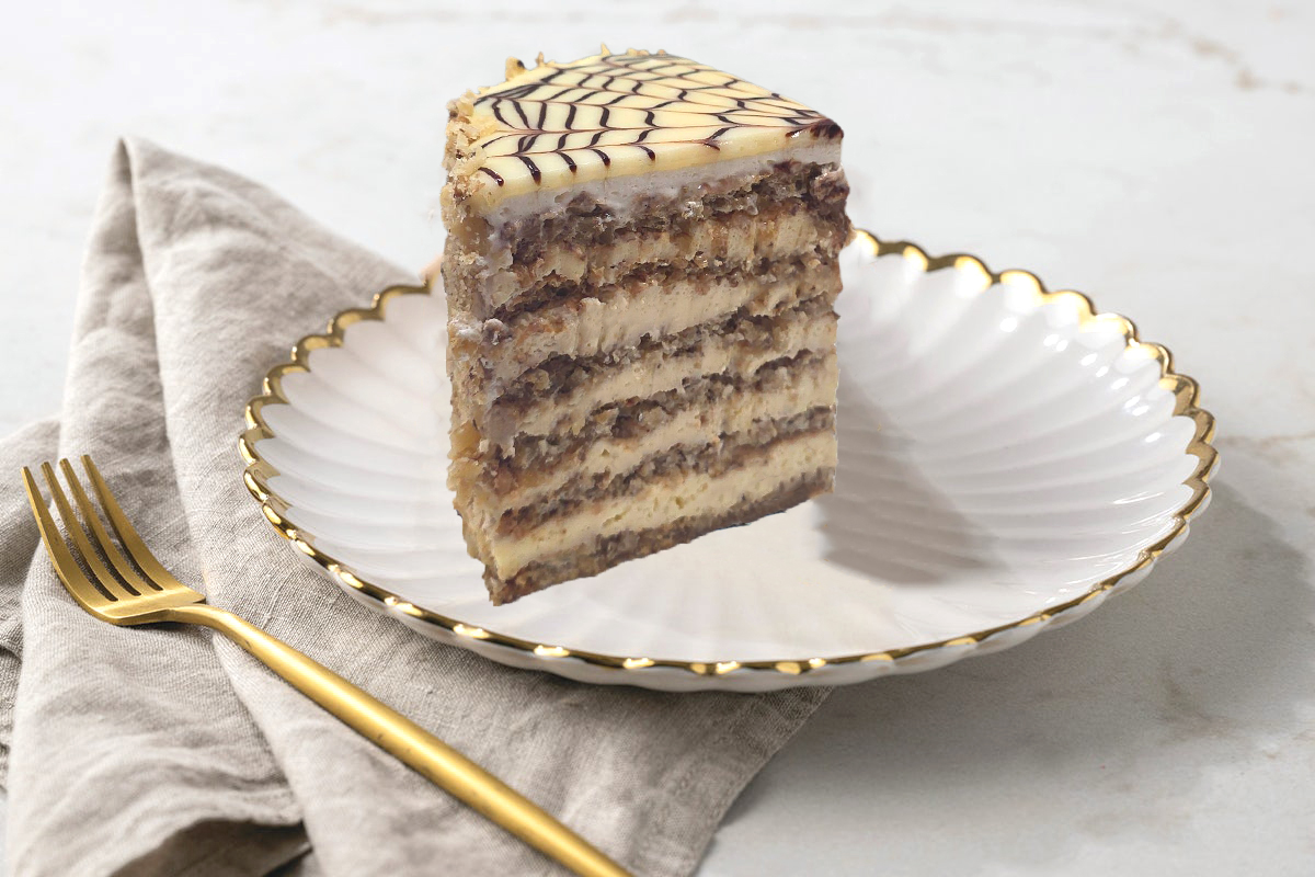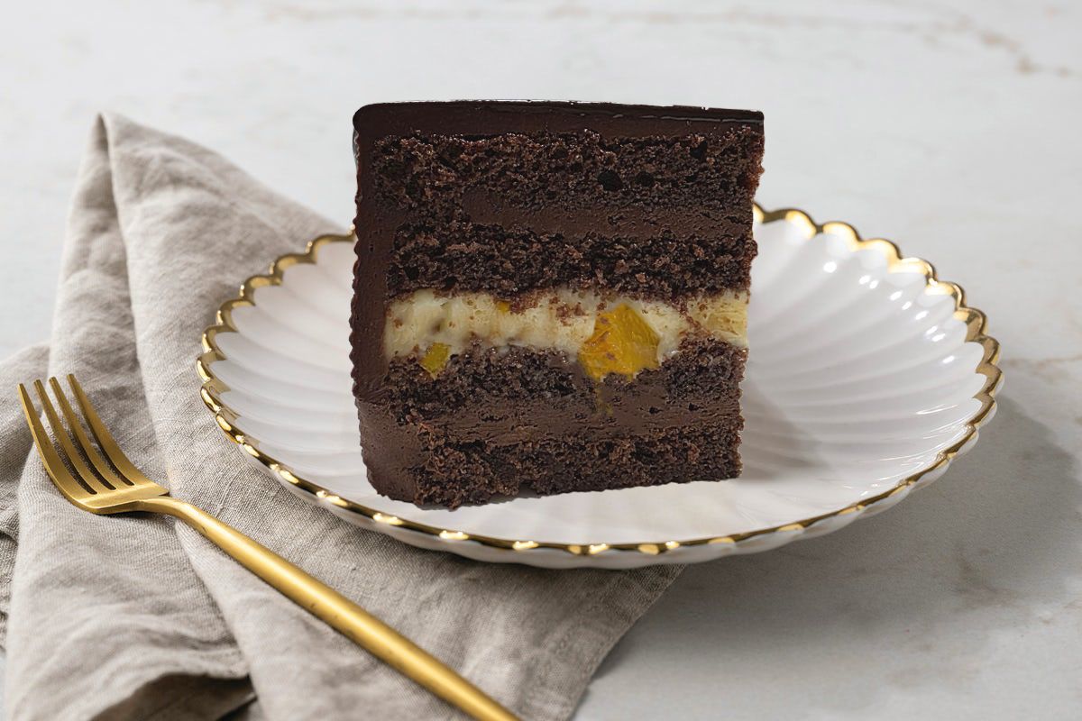 foaie de rulada 70g, amestec de: crema cu ciocolata, UNT 82% si coaja de portocala confiata 730g, decorat cu: crema cu ciocolata 90g, glazura de cacao 60g, ciocolata alba 25g si pasta de zahar 25g