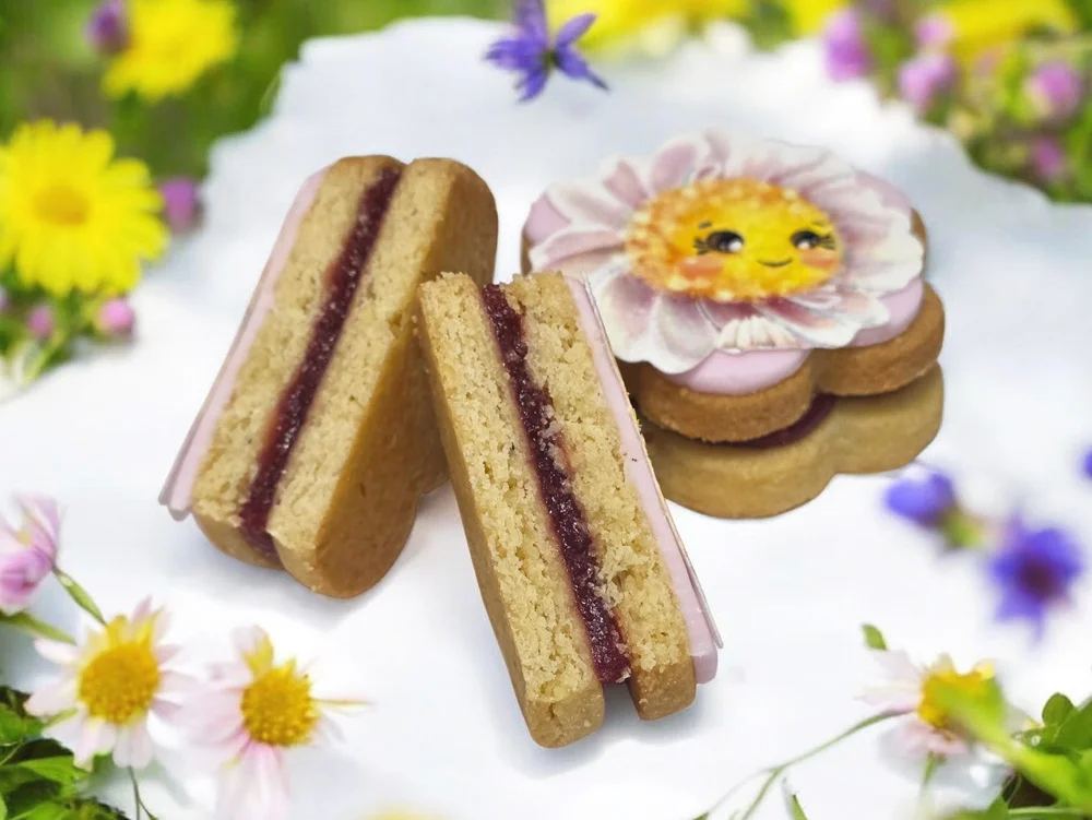 Ingrediente: aluat fraged cu pudra de MIGDALE 58% [faina alba de GRAU 550, UNT 82% (SMANTANA din LAPTE de vaca pasteurizat), pudra de MIGDALE 8% (100% MIGDALE), zahar, zahar brun, galbenus de OU pasteurizat (galbenus de OU, conservant: benzoat de sodiu), sare iodata, aroma de vanilie (apa demineralizata, solvent: propilen glicol, substante aromatizante, agent de ingrosare: guma xantan, conservant: benzoat de sodiu)], umplutura amestec cu glazura cu aroma de capsune si gem de capsune: glazura cu aroma de capsune 16% (zahar, apa, sirop de glucoza, amidon modificat, capsune 3%, aroma, stabilizator: celuloza, acidifiant: acid tartric, conservant: sorbat de potasiu, coloranti: caramel cu SULFIT de amoniu, carmin , caroteni), gem de capsune 4% (capsune, zahar, sirop de glucoza-fructoza, agent gelatinizant: pectina, acidifiant: acid citric), decorat cu pasta de zahar 22% [(zahar, sirop de glucoza, grasime vegetala: miez de palmier, nuca de cocos, amidon de porumb, agent de umidificare: glicerol, apa, agent de ingrosare: guma de xantan, aroma naturala de vanilie, coloranti (in functie de model): Alb - dioxidul de titan, Albastru – albastru briliant/dioxidul de titan/ albastru patent V/ negru PN, Bej – dioxidul de titan-ponceau 4R(*)-tartrazina(*), Fuchsia dioxidul de titan-azorubina, Galben tartrazina(*), Maro caramel de sulfit de amoniud-carbune vegetal-brun HT, Mov carmin-albastru briliant, Negru galben apus de soare FCF(*)-albastru briliant-rosu allura AC(*), Rosu rosu allura AC (*)-galben apus de soare FCF (*)-eritrozina(*), Roz dioxidul de titan-ponceau 4R(*), Verde tartrazina(*)-albastru briliant / tartrazina(*)-albatru patent V], gel neutru transparent (sirop de glucoza, apa, zahar, agent ingrosare: pectina, caragenan, regulator aciditate: acid citric, citrat trisodic, conservant: sorbat de potasiu, indulcitor: aspartam, acesulfam potasiu).